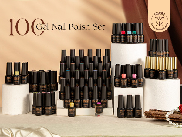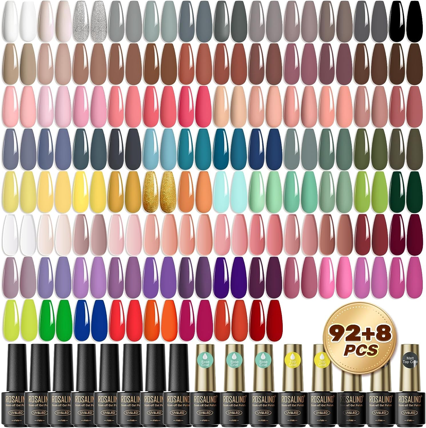Juego de 100 esmaltes de uñas de gel ROSALIND de 92 colores: esmalte de uñas de gel de 92 colores + 3 capas base de botella + 3 botellas de capa superior brillante que no se limpia + 2 capas superiores mate de botellas. Satisface tus necesidades básicas, no es necesario comprar la capa base y la capa superior por separado. 92 colores clásicos y de moda son adecuados para todas las estaciones. ¡Deja que tu vida esté llena de color!